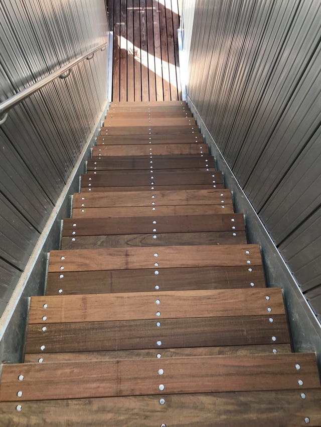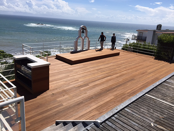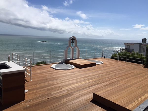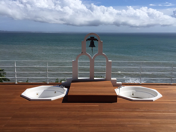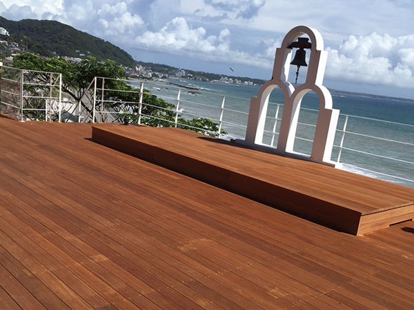 施工のポイント:葉山ホテル音羽ノ森のウッドデッキ改修工事を造らせていただきました!!材料はセランガンバツ材でデッキ面はリブ付加工材。施工のポイントは2台あるジャグジー風呂も利用でき、取り外しもでき移動可能なステージも造りました!!